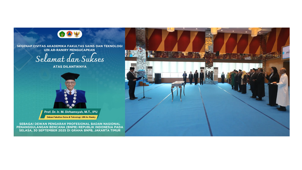 Banda Aceh (Media FST)— Ucapan selamat dan sukses mengalir atas pelantikan Dekan Fakultas Sains dan Teknologi UIN Ar-Raniry Banda Aceh sebagai Dewan Pengarah Profesional Badan Nasional Penanggulangan Bencana (BNPB) Republik Indonesia. Pelantikan ini merupakan bentuk kepercayaan negara terhadap komitmen, integritas, dan pengalaman panjang beliau dalam bidang kebencanaan dan pelayanan publik.