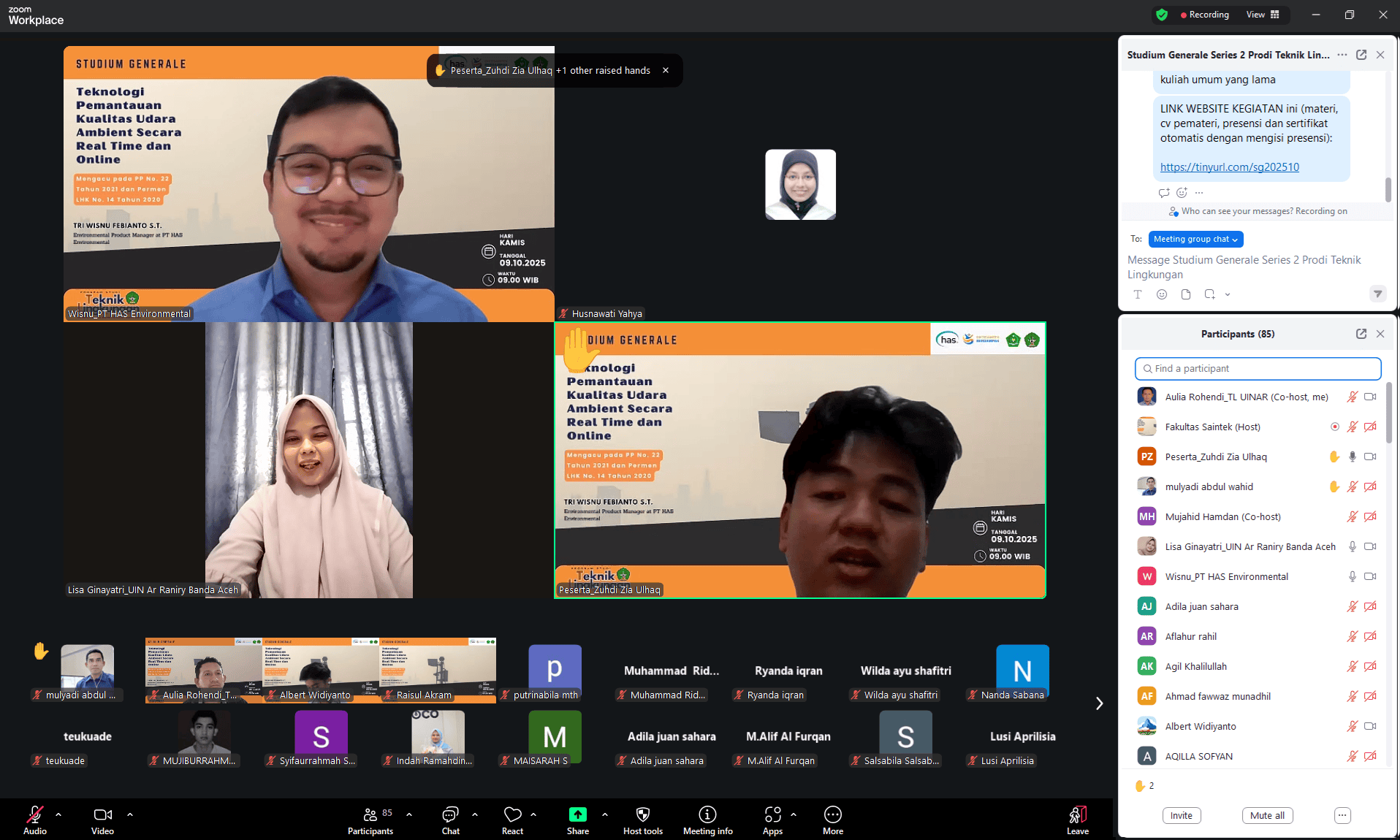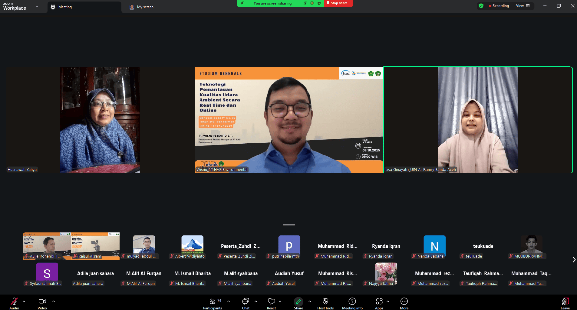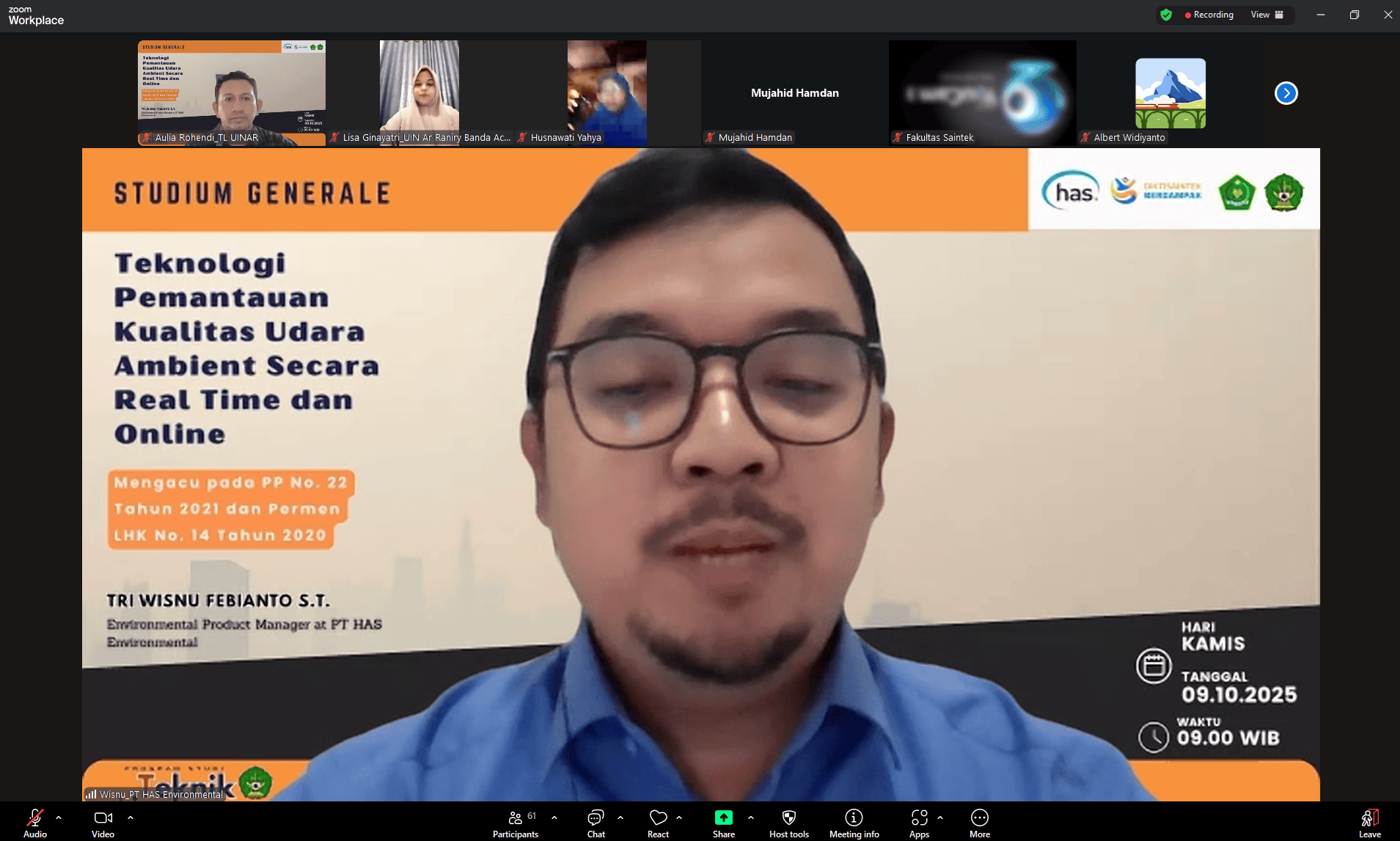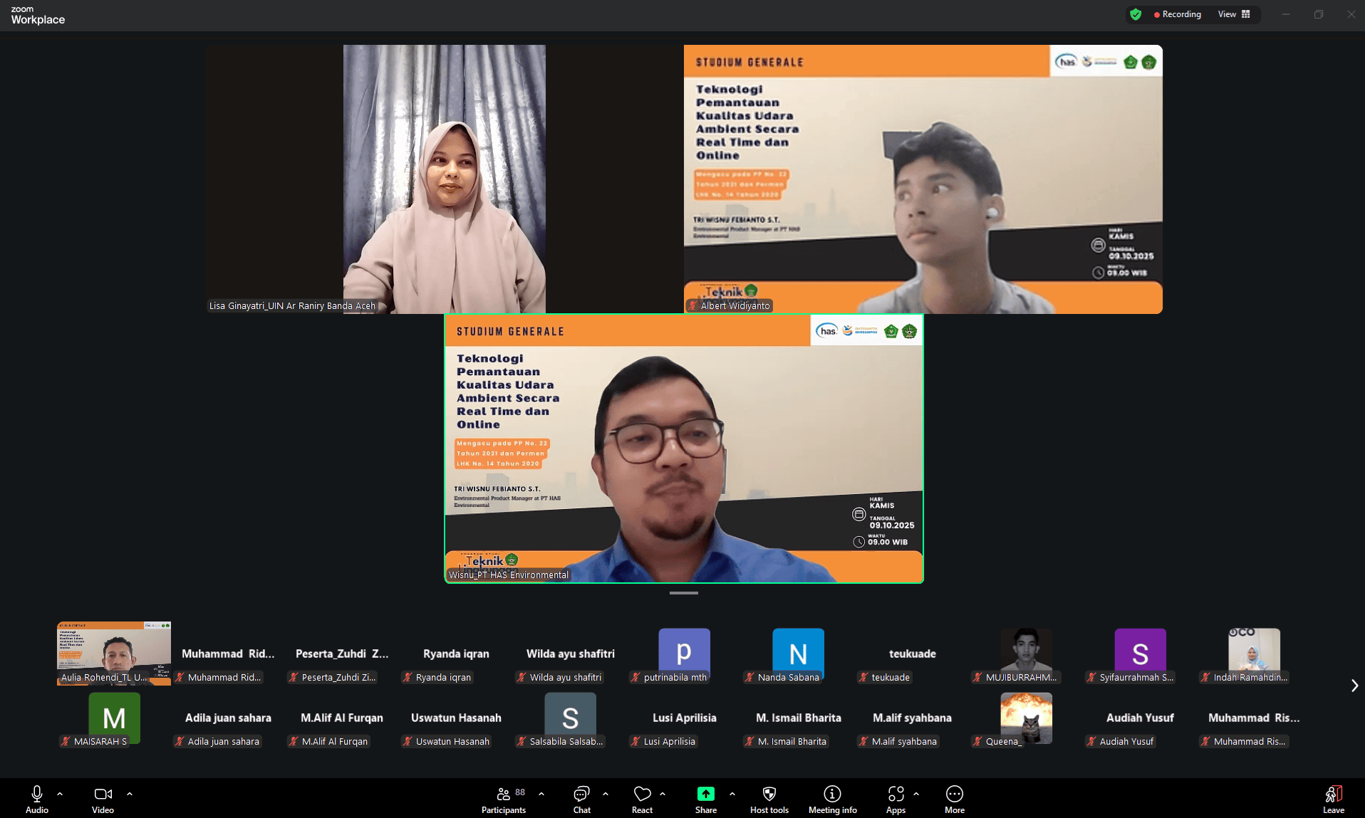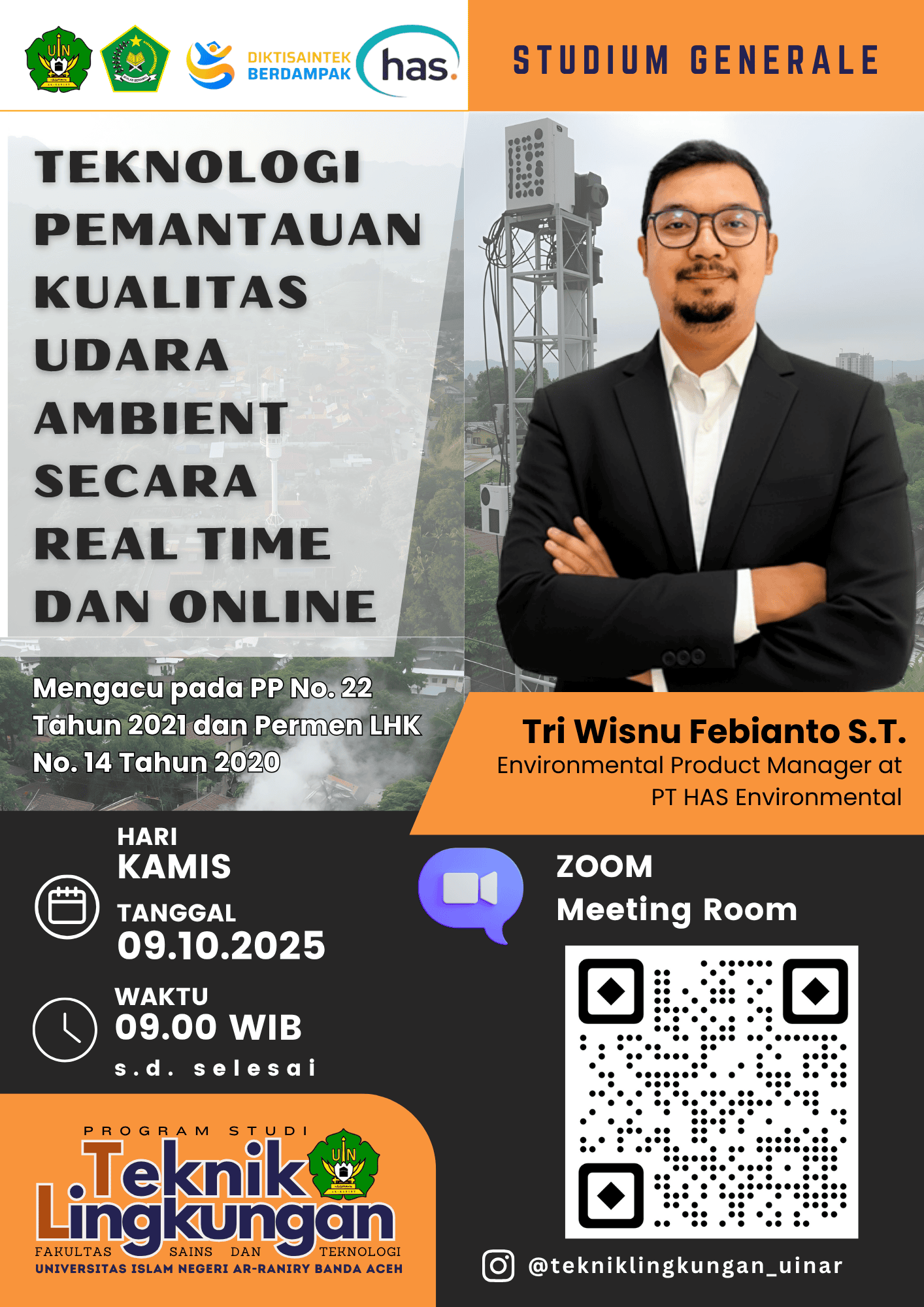 Pada hari Kamis, 9 Oktober 2025, Program Studi Teknik Lingkungan UIN Ar-Raniry menggelar Studium Generale bertajuk “Teknologi Pemantauan Kualitas Udara Ambient Secara Real Time dan Online”. Acara ini dilaksanakan secara daring melalui Zoom Meeting, dipandu oleh moderator Ibu Lisa Ginayatri, M.T.